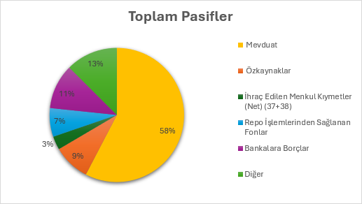 2025 yılında mevduatlar, toplam pasifin %58’ini, mevduat dışı kaynaklar %33’ünü, özkaynaklar ise %9’unu oluşturdu. 2025 şubat ayında, geçen yılın aynı ayına göre, Mevduatın toplam pasiflerin içindeki payı yüzde 3 azaldı, Özkaynakların payı aynı kaldı ve Mevduat Dışı Kaynakların Payı %3 arttı. Mevduat dışı kaynakların payındaki artışa, bankalara borçlar ve repo işlemlerinden sağlanan fonların payındaki artış etkili oldu.