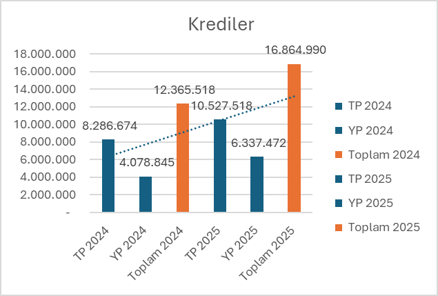 Krediler 2025 şubat ayında bir önceki yılın aynı ayına göre 49% artışla 16.864.990,48 milyon TL olarak gerçekleşti. Toplam kredi hacmindeki artış, bankaların kredi portföyünün büyüdüğünü ve daha fazla kredi vermeye başladıklarını gösteriyor. 2025 şubat ayında TL cinsinden verilen krediler, 2024 şubat ayında TL cinsinden verilen kredilere göre artmıştır. Bu yılın şubat ayında geçen yılın aynı ayına göre Türk lirası (TL) cinsinden krediler %27 oranında artmıştır. TL cinsinden kredilerindeki artış, yerel ekonomideki iyileşmenin veya bankaların Türk lirası cinsinden kredi verme eğilimlerinin artığını gösteriyor. Bu bankaların söz konusu ayda geçen yılın aynı ayına göre iç piyasada daha aktif olduklarını ve yerel işletmelerin daha fazla finansmana ihtiyaç duyduklarını gösteriyor.