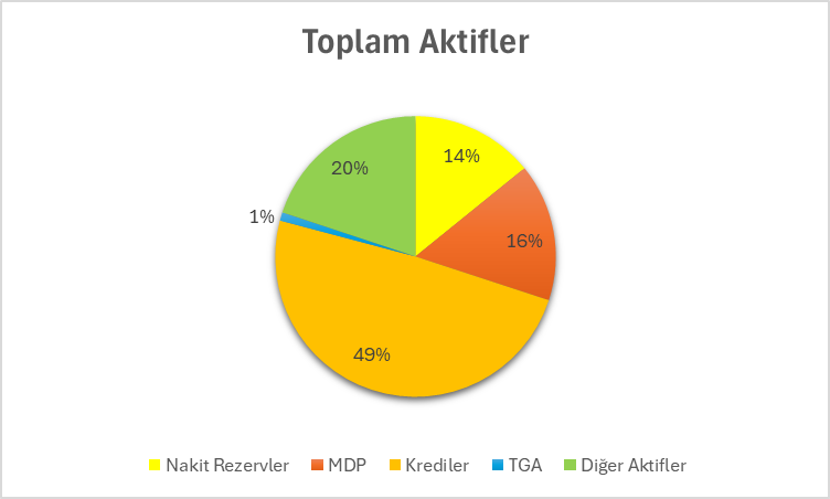 2025 şubat ayında, geçen yılın aynı ayına göre, Nakit Rezervleri toplam aktiflerin içindeki payı yüzde 3 arttı, Menkul Değerler yüzde 1 azaldı, Krediler yüzde 1 azaldı, TGA ve Diğer Aktifler aynı kaldı. Böylece krediler %49 pay ile sektörün en büyük aktif kalemi olmayı sürdürdü.