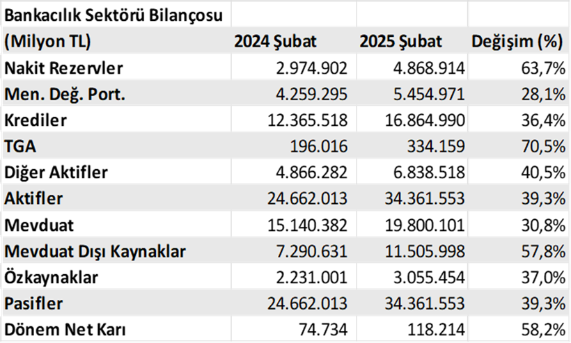 Türk bankacılık sektörünün aktif büyüklüğü 2025 şubat aynı ayına göre %39,3 artışla 34.361.553 milyon TL gerçekleşti.