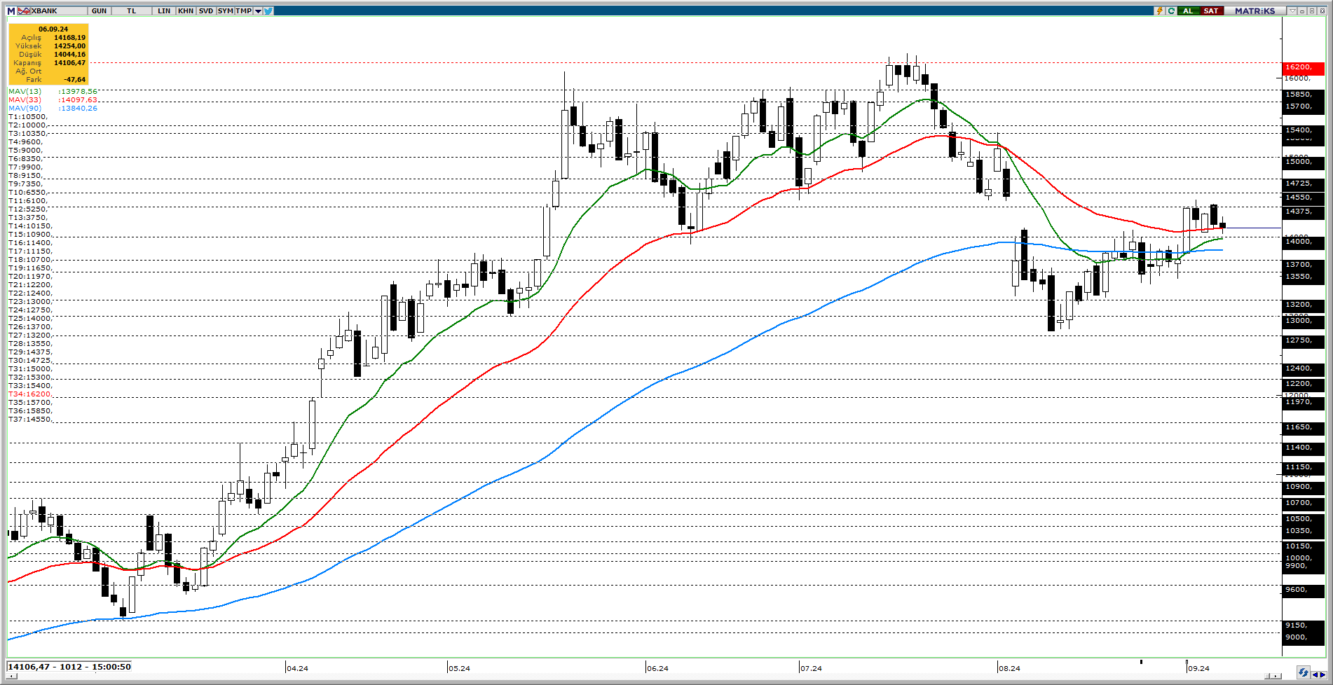 Referans göstergeler olarak takip ettiğimiz 13, 33 ve 90 günlük üssel hareketli ortalamalar üstünde fiyatlanan bankacılık endeksinde pozitif ivmelenmenin devam etmesi durumunda 14375, 14550 ve 14725 seviyelerine hareket edebilir. Aksi taktirde olası bir geri çekilme durumunda ise 14000, 13700 ve 13550 seviyelerine geri çekilebilir.
