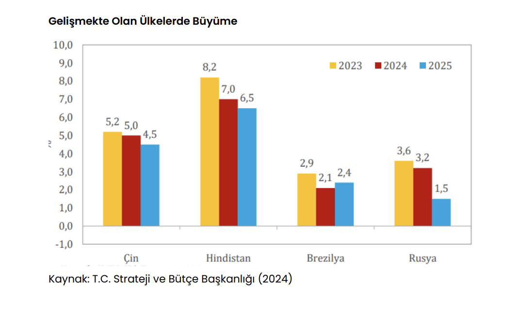 Bu gelişmelerle birlikte 2025’te küresel büyümenin ılımlı kalması ve 2025 sonrası yıllarda da hafifçe düşmesi öngörülüyor. Küresel reel GSYİH büyümesinin 2024'te %3,4 ve 2025'te %3,5 olmasının ardından 2026'da %3,3'e ve 2027'de %3,2'ye düşmesi öngörülüyor. Önceki projeksiyonlara kıyasla yakın vadede daha iyi beklentiler, ABD ve Çin'deki güçlü ekonomik verileri ile hem Çin'de çoğunlukla yerel yönetimlerin mali kısıtlamalarını hafifletmek için uygulanan hem de İngiltere’de uygulamaya konan mali teşvikleri yansıtıyor. Ancak ABD seçimlerinin sonucu önemli belirsizlik yaratıyor. ABD başkanlık kampanyası sırasında yapılan açıklamalarla ilgili zamanlama ve taahhüt derecesini ölçmek bu aşamada zor olsa da, ABD için temel projeksiyonlar hâlihazırda daha sıkı göç politikalarını ve 2017'de başlatılan ve 2025'te sona ermesi planlanan kişisel ve kurumsal gelir vergisi kesintilerinin uzatılmasını içeriyor.