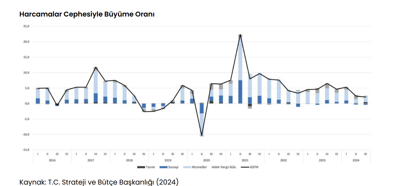 Türkiye ekonomisi 3. çeyrekte yıllık %2,1 (beklenti %2,6’ydı), çeyreklik olarak da %0,2 (beklenti %0,1 daralmaydı) ile beklentilerin altında büyüme performansı gösterdi. 3. çeyrekte beklenti altı gelen büyüme verileri sonrasında 2. çeyrekte %2.5 olan yıllık büyümenin %2,4’e ve yine 2. çeyrekte %0.1 olan büyümenin %0.2 daralma olarak aşağı yönde revize edildi. Böylelikle bu yılın ikinci ve üçüncü çeyreğinde ekonominin daralması sonucunda teknik anlamda Türkiye ekonomisi çeyreklik büyüme bağlamında resesyona girmiş oldu. Yılın ilk dokuz ayında yıllık büyümenin %3.2 oranında gerçekleştiği görülüyor.