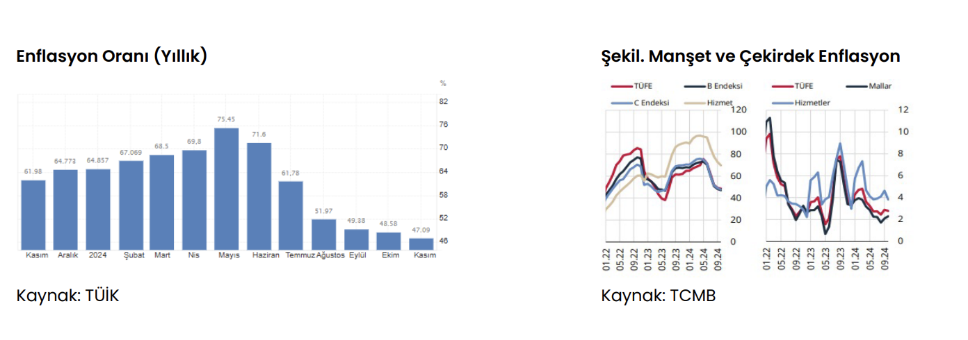2024 yılı sonunda enflasyonun Merkez Bankası üst tahmin bandına olan %46’ya yakın bir seviye olan %45.3 seviyesinde tamamlamasını beklerken, 2025 yılsonu enflasyon tahminimiz ise %28’dir. 2025 yılında enflasyon için yukarı yönlü risklerin aşağı yönlü risklere göre daha güçlü olduğunu düşünüyoruz. Maliye politikasının para politikası ile eşgüdümü, yönetilen ve yönlendirilen fiyatlarda dezenflasyon süreci ile uyumlu fiyatlama süreci, özel sektör tarafında fiyatlama davranışlarındaki bozulmadaki iyileşmeyi ve enflasyonda yaşanabilecek katılığı yukarı yönlü riskler olarak değerlendiriyoruz. Bunun yanı sıra Merkez Bankası’nın sıkılığı korumaya devam eden politikaları, TL’de reel değerlenme ve uluslararası enerji fiyatlarındaki düşük seviyelerin de enflasyon için aşağı yönlü riskler olarak değerlendiriyoruz.