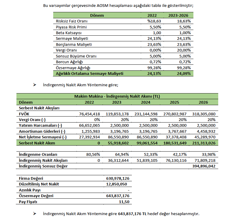 • Makim Makina’nın fiyat tespitinde Piyasa Çarpan Analizi metoduyla birlikte İndirgenmiş Nakit Akımları yöntemi de kullanılmıştır. İNA’nın şirket büyüme potansiyelini, nakit üretme kabiliyetini, gelecek dönemde ihtiyaç duyacağı fon miktarını ve yönetimin gelecek yıllardaki şirket performans beklentisini göstermesi açısından en uygun yöntem olduğu akademik makalelerde ifade edilmekte ve piyasade sıkça bu yöntem kullanılmaktadır. Makim Makina firma değerlemesinde İNA’nın kullanılmasını olumlu değerlendiriyoruz.