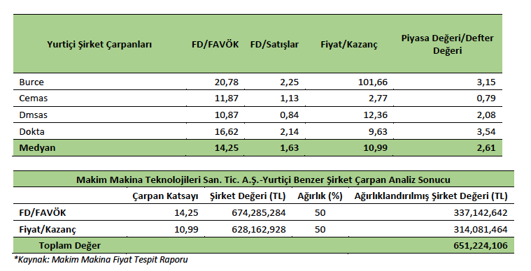 ➢ Yurt İçi Benzer Şirket Çarpan Analizi, Borsa İstanbul’da işlem gören ve ana faaliyet konusu Makim Makina Teknolojileri San. Ve Tic. A.Ş. ile benzer olan şirketler seçilerek analize dahil edilmiştir.