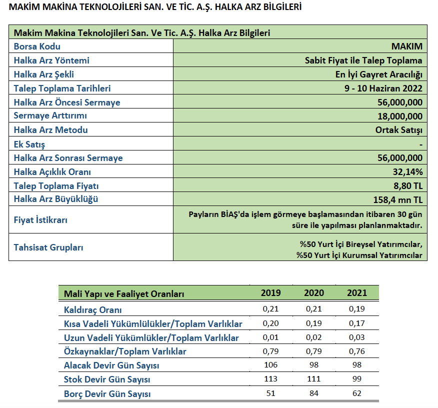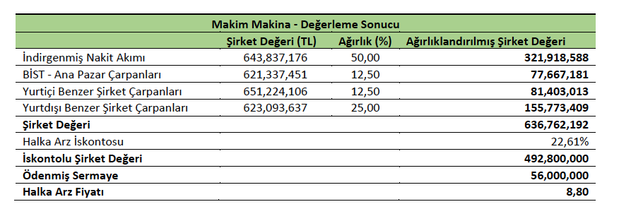 • Sonuç olarak, Makim Makina’nın halka arz fiyatının tespitinde %22,61 halka arz iskontosu sonrası hesaplanan 8,80 TL hisse başı talep toplama fiyatının makul olduğu kanaatindeyiz.