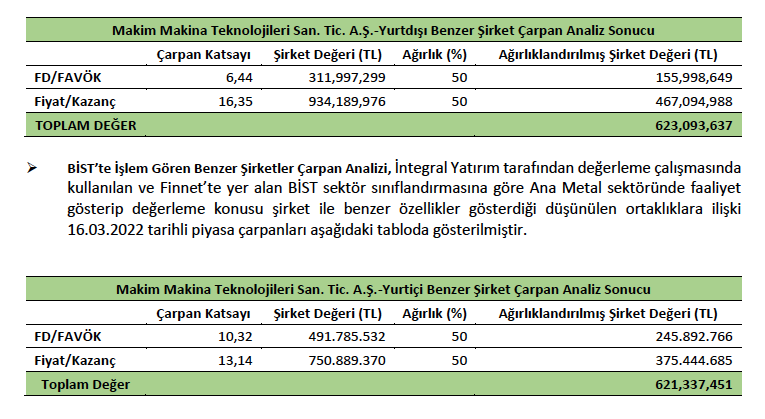 • İntegral Yatırım tarafından Makim Makina’nın halka arz fiyat belirlenmesinde yurt içi ve yurt dışı benzer faaliyet gösteren şirketler ile BİST’te işlem gören şirket çarpanları esas alınmakla birlikte 3 grupta kategorize edilerek Firma Değeri/FAVÖK (FD/FAVÖK), Fiyat/Kazanç (F/K) çarpanlarının medyanı kullanılmıştır. Bu değişkenlerin değerlemede kullanılmasını makul buluyoruz.