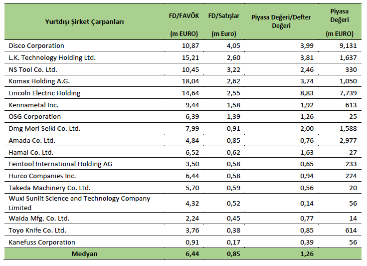 Yurtdışı Benzer Şirket Çarpan Analizi, bu analizde kullanılan şirketler seçilirken Makim Makina faaliyet alanlarına uygun şirketler seçilmiş ve değerlemeye dahil edilmiştir.