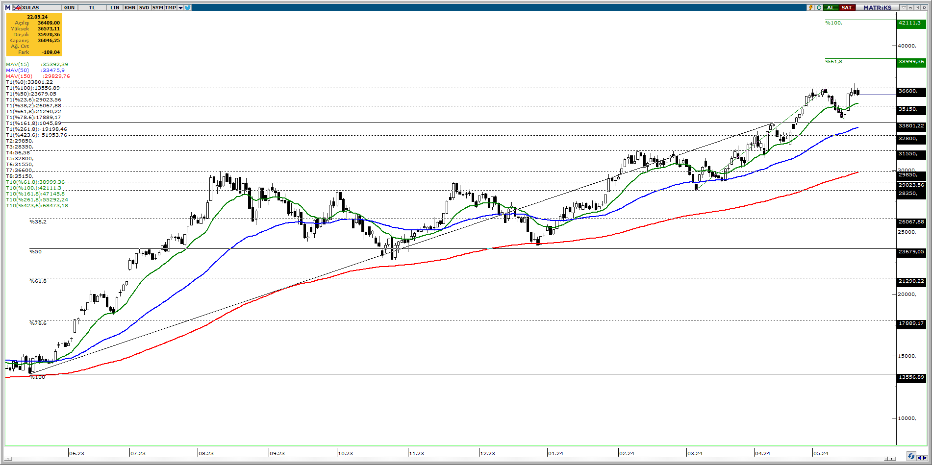 2023 Mayıs ayından bu yana genel yükseliş ivmesini sürdüren Ulaştırma endeksi, 36600 seviyesinden baskı görse de bir önceki direnç seviyesi olan Fibonacci Retracement 33800 seviyesinden destek alarak referans göstergeler olarak takip ettiğimiz 15, 50 ve 150 günlük üssel hareketli ortalamalar üzerinde yükselişini sürdürdü. Endekste yükseliş ivmesinin devam etmesi durumunda ilk olarak 36600, bu seviyenin aşılması durumunda ise Fibonacci Expension 39000 ve 40100 seviyelerine doğru yükseliş devam edebilir. Aksi takdirde endekste 36600 seviyesinden baskı görerek geri çekilmenin gerçekleşmesi durumunda ise 35150, 33800 ve 32800 seviyelerine doğru düşüş gözlenebilir.