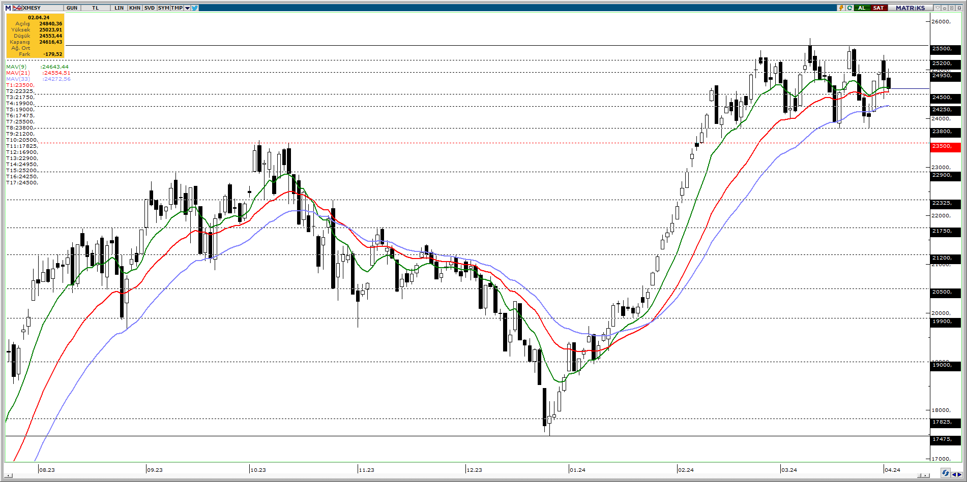 Alt bantta 23800 üst bantta 25500 seviyeleri arasında yatay hareketini sürdüren Metal Eşya Makine endeksi gün içinde 25000 seviyesine kadar yükselip geri dönse de referans göstergeler olarak takip ettiğimiz 21 ve 33 günlük üssel hareketli ortalamaların üstünde fiyatlanmaya devam ediyor. Endekste pozitif fiyatlanmanın devam etmesi durumunda 24950, 25200 ve 25500 seviyelerine doğru haraketlilik olabilir. Pozitif fiyatlanmalar devam etse de kalıcı yükseliş için 25500 seviyesi üstünde kapanış aranabilir. Aksi takdirde endekste yaşanabilecek olası geri dönüşlerde ise 24500, 24250 ve 23800 seviyelerine doğru çekilme izlenebilir. Endekste geri çekilme olsa dahi 23800 seviyesi altına inilmediği takdirde negatif görünümden söz edilemeyebilir.