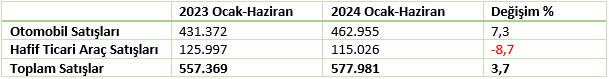 •    Böylelikle otomobil ve hafif ticari araç satışları 2024 Ocak-Haziran döneminde yüzde 3,7 oranında artış gösterdi.