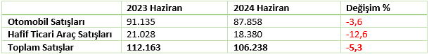 Dönemsel olarak karşılaştırma yaptığımızda 2024 Haziran ayında otomobil ve hafif ticari araç satışlarında gözle görülür bir oranda azalış kaydedilmiştir.