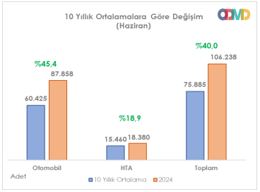 Tüm değerlendirmelerin yanı sıra otomobil ve hafif ticari araç satışlarının son 10 yıllık periyoduna baktığımızda satışlarda 2024 Haziran ayında yüzde 40,0 oranında artış yaşandığını görüyoruz. Bu oran Mayıs ayında yüzde 45,7 idi.