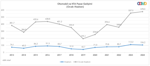Otomotiv Distribütörleri ve Mobilite Derneği (ODMD) tarafından açıklanan rapora göre; 2024 Ocak-Haziran dönemi otomobil ve hafif ticari araç toplam satışları bir önceki yılın aynı dönemine göre yüzde 3,7 oranında artarak 577.981 adet olarak gerçekleşti (Bu oran Ocak- Mayıs dönemi yüzde 6,0 artışla 471.743 adet idi).