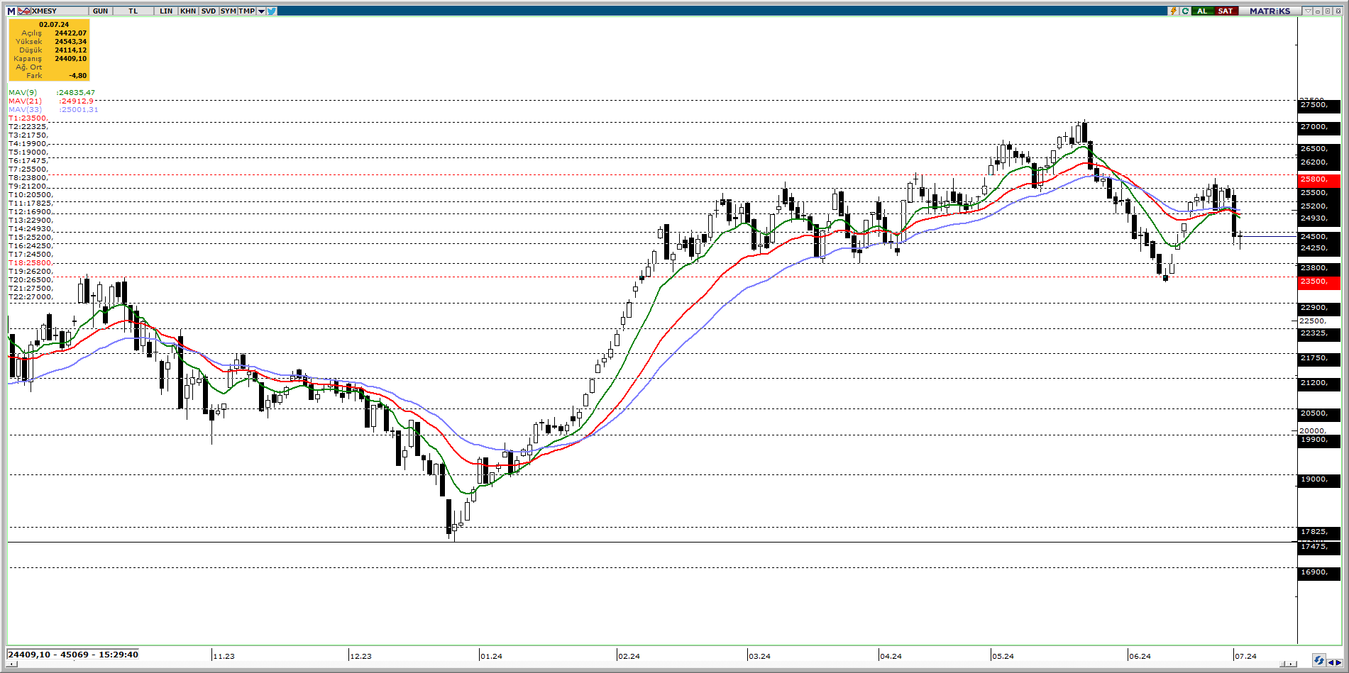 25800 seviyesinden gördüğü baskı ile düşüş ivmesini sürdüren Metal Eşya Makine endeksi, referans göstergeler olarak takip ettiğimiz 9, 21 ve 33 günlük üssel hareketli ortalamaların altında negatif fiyatlanmaya devam ediyor. Endekste baskılanmanın devam etmesi durumunda 24250, 23800 ve 23500 seviyelerine doğru geri çekilme gözlenebilir. Endekste geri çekilme gerçekleşse dahi 23500 (yılbaşından öneki tarihi zirve) seviyesi altına geçilmediği sürece orta vadeli pozitif görünümün devam edebileceğini söyleyebiliriz. Aksi takdirde endekste yaşanabilecek olası pozitif ivmeler gerçekleşmesi durumunda ise tekrar 24500, 24930 ve 25200 seviyelerine doğru yükseliş gözlenebilir.