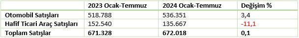 • - Böylelikle otomobil ve hafif ticari araç satışları 2024 Ocak- Temmuz döneminde yüzde 0,1 oranında artış gösterdi.