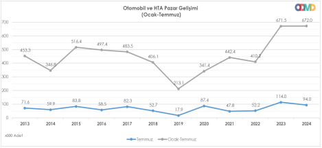 Otomotiv Distribütörleri ve Mobilite Derneği (ODMD) tarafından açıklanan rapora göre; 2024 Ocak-Temmuz dönemi otomobil ve hafif ticari araç toplam satışları bir önceki yılın aynı dönemine göre yüzde 0,1 oranında artarak 672.018 adet olarak gerçekleşti (Bu oran Ocak- Haziran dönemi yüzde 3,7 artışla 577.981 adet idi).