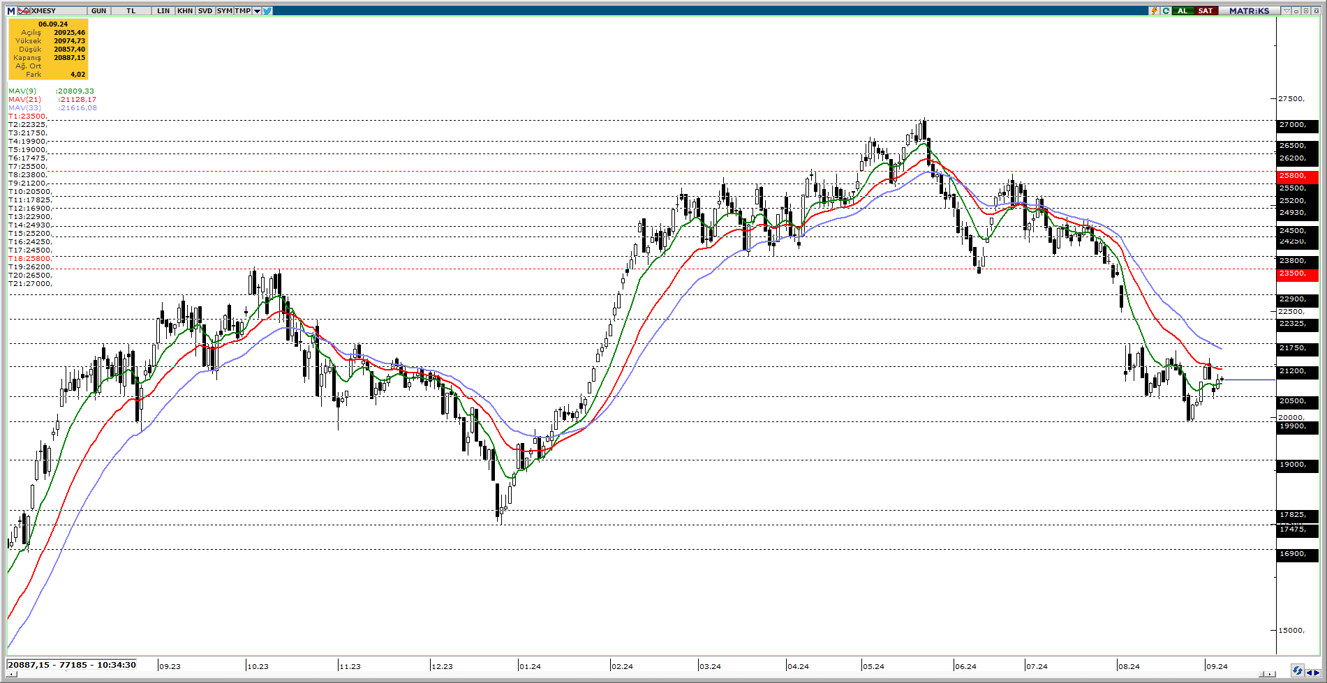 27000 seviyesinden gördüğü baskı ile düşüş ivmesini sürdüren Metal Eşya Makine endeksi, referans göstergeler olarak takip ettiğimiz 21 ve 33 günlük üssel hareketli ortalamaların altında negatif fiyatlanmaya devam ediyor. Endekste baskılanmanın devam etmesi durumunda 20500, 19900 ve 17825 seviyelerine doğru geri çekilme gözlenebilir. Aksi takdirde endekste yaşanabilecek olası pozitif ivmeler gerçekleşmesi durumunda ise tekrar 21200, 21750 ve 22325 seviyelerine doğru yükseliş gözlenebilir.