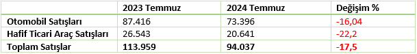 Dönemsel olarak karşılaştırma yaptığımızda 2024 Temmuz ayında otomobil ve hafif ticari araç satışlarında gözle görülür bir oranda azalış kaydedilmiştir.