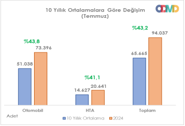 Tüm değerlendirmelerin yanı sıra otomobil ve hafif ticari araç satışlarının son 10 yıllık periyoduna baktığımızda satışlarda 2024 Temmuz ayında yüzde 43,2 oranında artış yaşandığını görüyoruz. Bu oran Haziran ayında yüzde 40,0 idi.