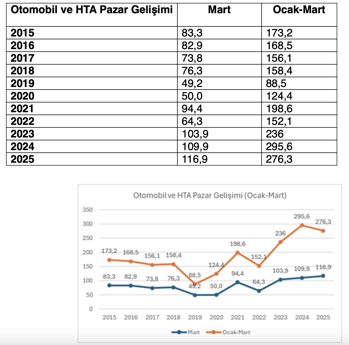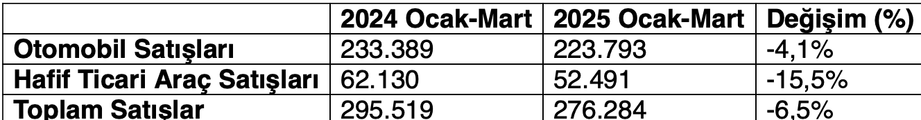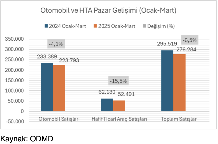 Otomotiv Distribütörleri ve Mobilite Derneği (ODMD) tarafından açıklanan verilere göre, 2025 yılı ocak-mart döneminde Türkiye'deki otomobil ve hafif ticari araç pazarı, bir önceki yılın aynı dönemine göre %6,5 oranında azalarak 276.284 adet oldu. 2025 Ocak-Mart ayında otomobil satışları, bir önceki yılın aynı dönemine göre %4,1 oranında azalarak 223.793 adede gerilerken, hafif ticari araç pazarı ise %15,5 oranında azalarak 52.491 adet oldu.