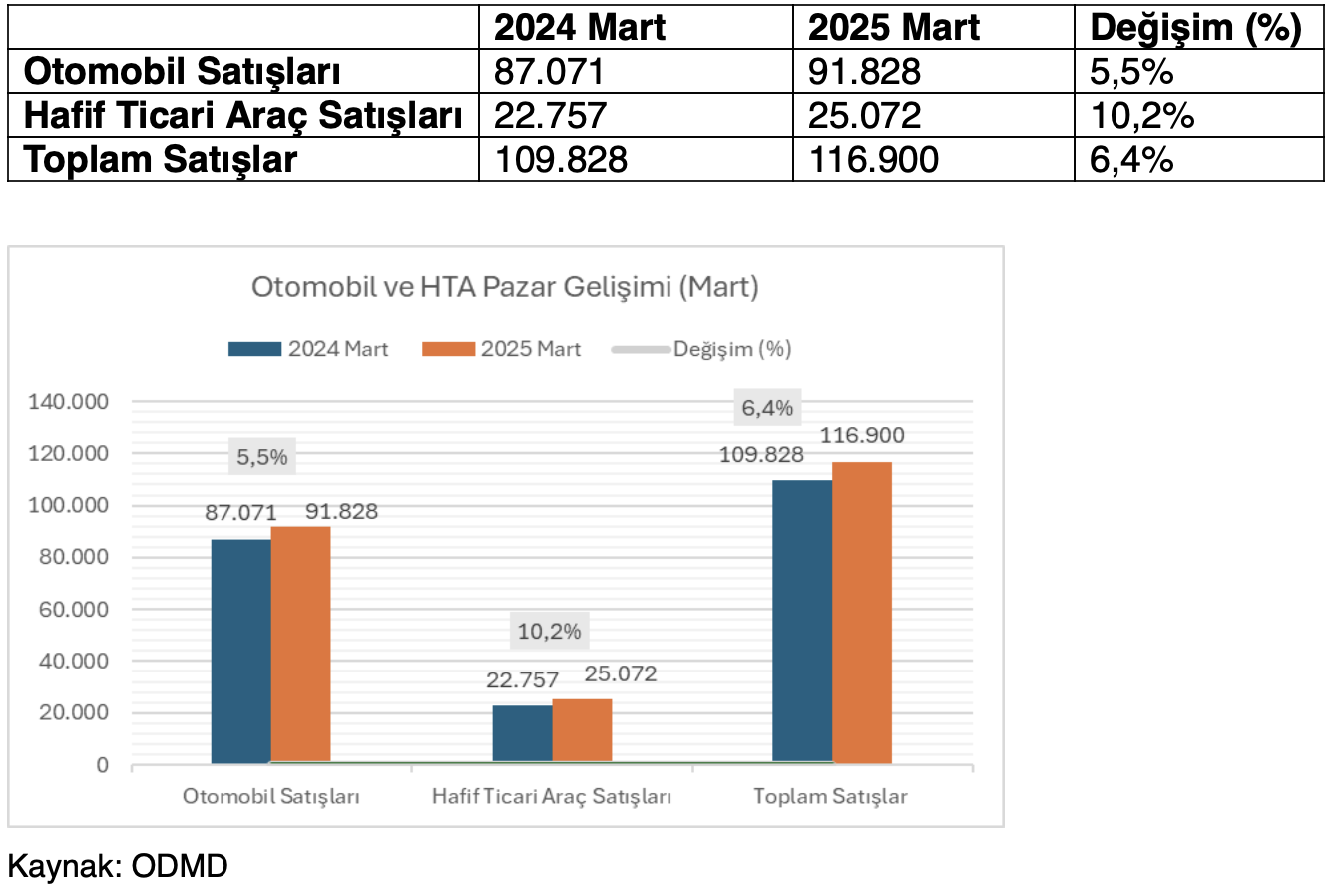 - Otomobil ve hafif ticari araç pazarı 2025 mart ayında geçen yılın aynı ayına göre yüzde 6,4 oranında artarak 116.900 adet oldu