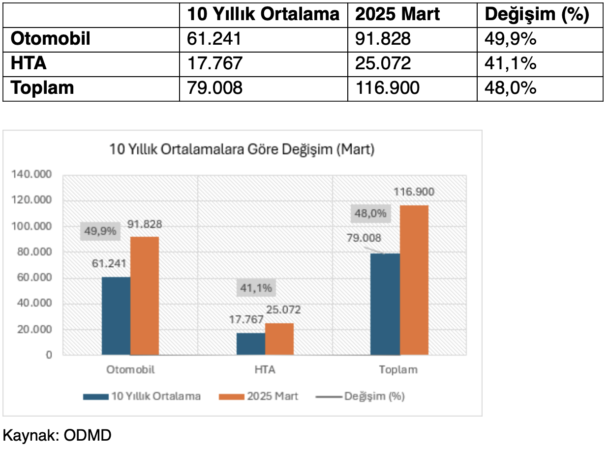 - Otomobil satışları, son 10 yıllık mart ayı ortalama satışlarına göre yüzde 49,9 oranında arttı.