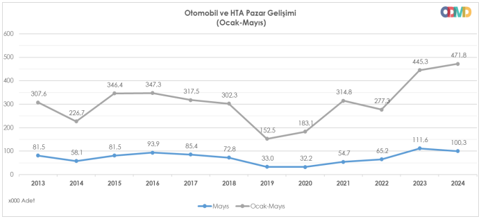 Otomotiv Distribütörleri ve Mobilite Derneği (ODMD) tarafından açıklanan rapora göre; 2024 Ocak-Mayıs dönemi otomobil ve hafif ticari araç toplam satışları bir önceki yılın aynı dönemine göre yüzde 6,0 oranında artarak 471.743 adet olarak gerçekleşti (Bu oran Ocak- Nisan dönemi yüzde 11,3 artışla 371.438 adet idi).