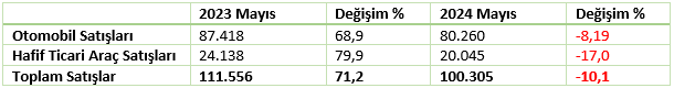 Dönemsel olarak karşılaştırma yaptığımızda 2024 Mayıs ayında otomobil ve hafif ticari araç satışlarında gözle görülür bir oranda azalış kaydedilmiştir.