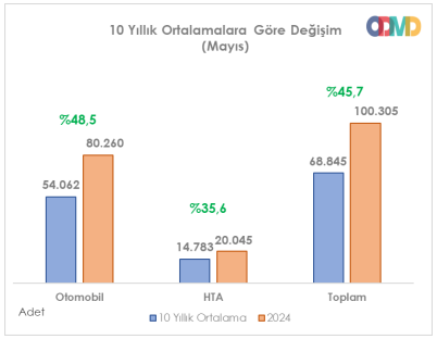 Tüm değerlendirmelerin yanı sıra otomobil ve hafif ticari araç satışlarının son 10 yıllık periyoduna baktığımızda satışlarda 2024 Mayıs ayında yüzde 45,7 oranında artış yaşandığını görüyoruz. Bu oran Nisan ayında yüzde 16,2 idi.