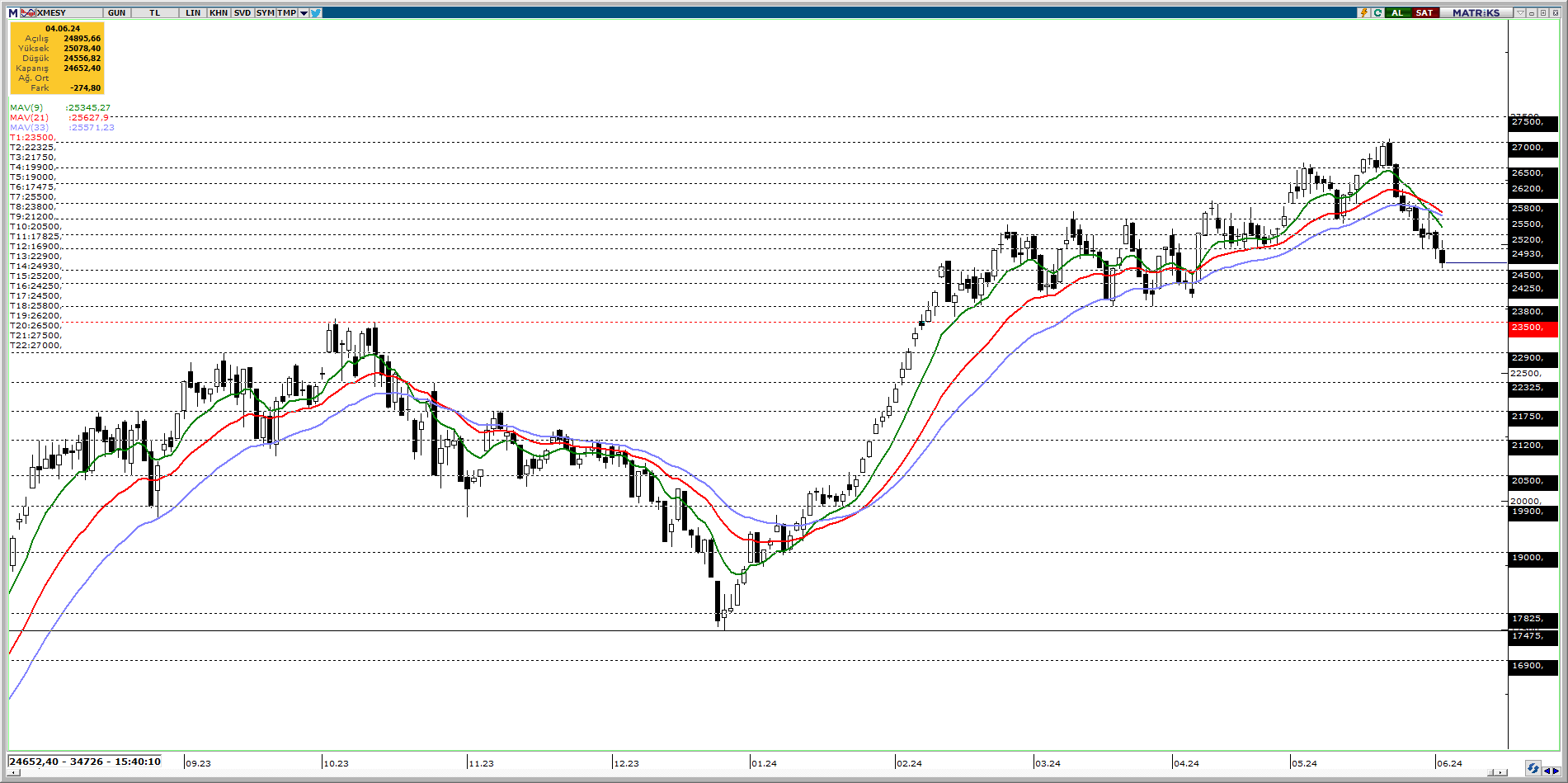 27000 seviyesinden gördüğü baskı ile düşüş ivmesini sürdüren Metal Eşya Makine endeksi, referans göstergeler olarak takip ettiğimiz 9, 21 ve 33 günlük üssel hareketli ortalamaların altında negatif fiyatlanmaya devam ediyor. Endekste baskılanmanın devam etmesi durumunda 24500, 24250 ve 23800 seviyelerine doğru geri çekilme gözlenebilir. Endekste geri çekilme gerçekleşse dahi 23500 (yılbaşından öneki tarihi zirve) seviyesi altına geçilmediği sürece kısa vadeli pozitif görünümün devam edebileceğini söyleyebiliriz. Bununla birlikte endekste yaşanabilecek olası pozitif ivmeler sonrasında tekrar 24930, 25200 ve 25500 seviyelerine doğru yükseliş gözlenebilir.