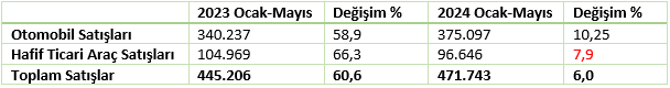 • Böylelikle otomobil ve hafif ticari araç satışları 2024 Ocak-Mayıs döneminde yüzde 6,0 oranında artış gösterdi.