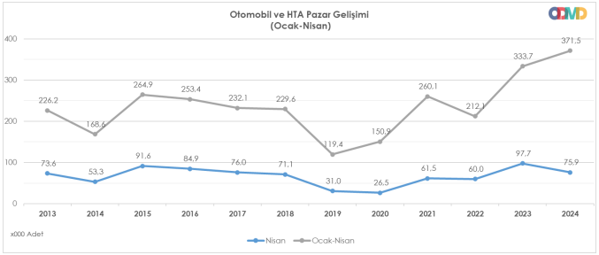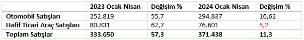 Otomotiv Distribütörleri ve Mobilite Derneği (ODMD) tarafından açıklanan rapora göre; 2024 Ocak-Nisan dönemi otomobil ve hafif ticari araç toplam satışları bir önceki yılın aynı dönemine göre yüzde 11,3 oranında artarak 371.438 adet olarak gerçekleşti (Bu oran Ocak- Mart dönemi yüzde 25,2 artışla 295.519 adet idi).