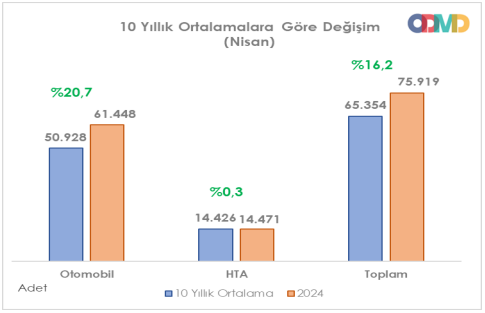 Tüm değerlendirmelerin yanı sıra otomobil ve hafif ticari araç satışlarının son 10 yıllık periyoduna baktığımızda satışlarda 2024 Nisan ayında yüzde 16,2 oranında artış yaşandığını görüyoruz. Bu oran Mart ayında yüzde 50,9 idi.