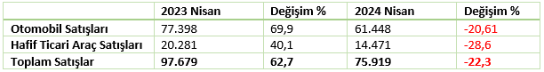 • Otomobil satışları, 2024 Nisan ayında bir önceki yılın Nisan ayına göre yüzde 20,61 azalarak 61.448 adet oldu. Hafif ticari araç satışları yüzde 28,6 azalarak 14.471 adet oldu. Böylelikle otomobil ve hafif ticari araç satışları 2024 Mart ayında yüzde 22,3 oranında azalış gösterdi (Bu oran Mart ayında yüzde 5,7 artışla 109.828 adet idi). Dönemsel olarak karşılaştırma yaptığımızda 2024 Nisan ayında otomobil ve hafif ticari araç satışlarında gözle görülür bir oranda azalış kaydedilmiştir.