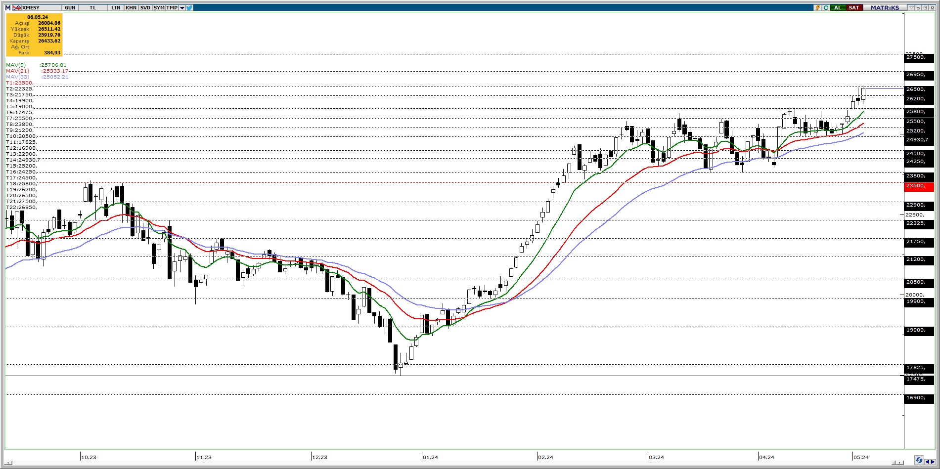 Alt bantta 23800 üst bantta 25800 seviyeleri arasında yatay hareketini 25800 seviyesinin aşılmasıyla sonlandıran Metal Eşya Makine endeksi gün içinde 26500 seviyesinden baskı görse de referans göstergeler olarak takip ettiğimiz 9, 21 ve 33 günlük üssel hareketli ortalamaların üstünde fiyatlanmaya devam ediyor. Endekste pozitif fiyatlanmanın devam etmesi durumunda 26500, 26950 ve 27500 seviyelerine doğru haraketlilik olabilir. Aksi takdirde endekste yaşanabilecek olası geri dönüşlerde ise 26200, 25800 ve 25500 seviyelerine doğru çekilme izlenebilir. Endekste geri çekilme olsa dahi ortalamalar üstünde kalındığı sürece genel pozitif görünüm devam edebilir.