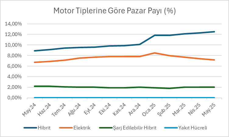 Güç aktarma sistemlerine göre pazar payı verileri, hibrit araçların giderek daha fazla tercih edildiğini göstermektedir. Mayıs 2024'te %8,9 olan hibrit araçların pazar payı, Mayıs 2025'e gelindiğinde %12,5’e yükselmiş, bu da hibrit araçlara olan talebin önemli ölçüde arttığını ortaya koymuştur. Elektrikli araçların payı ise 2024 boyunca artış göstererek %7,8 seviyesine ulaşmış, 2025’in ilk aylarında ise hafif bir azalma ile Mayıs 2025'te %7,2’ye gerilemiştir. Şarj edilebilir hibrit araçların pazar payı ise genelde %2 civarında stabil kalmıştır. Yakıt hücreli araçların pazar payı ise sıfırda kalmaya devam etmiş, bu teknoloji henüz pazarda belirgin bir yer edinememiştir. Genel olarak, hibrit araçlar pazarın büyüyen segmenti olurken, elektrikli araçlarda küçük dalgalanmalar gözlemlenmektedir.