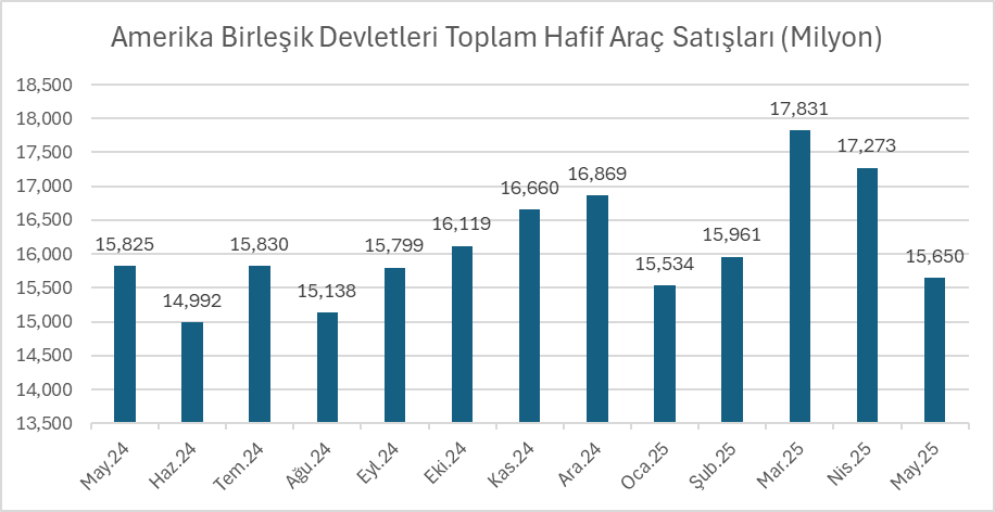 Amerika Birleşik Devletleri’nde toplam hafif araç satışları, Mayıs 2024 ile Mayıs 2025 arasında dalgalı ancak genel olarak güçlü bir seyir izlemiştir. 2024 yılı mayıs ayında 15,825 milyon adet olan satışlar yılın sonuna doğru artış göstererek Aralık 2024’te 16,869 milyona ulaşmış, 2025’in ilk çeyreğinde ise daha da ivme kazanarak Mart 2025’te 17,831 milyon ile zirve yapmıştır. Ancak Mart–Nisan’daki tarife öncesi alım atağının ardından Mayıs 2025’te satışlar %12,2 oranında düşerek 15,650 milyon adede gerilemiştir. Genel olarak, ABD hafif araç pazarında yıl içinde mevsimsel dalgalanmalar görülmekle birlikte, satışların güçlü bir düzeyde seyretmeye devam ettiği söylenebilir.