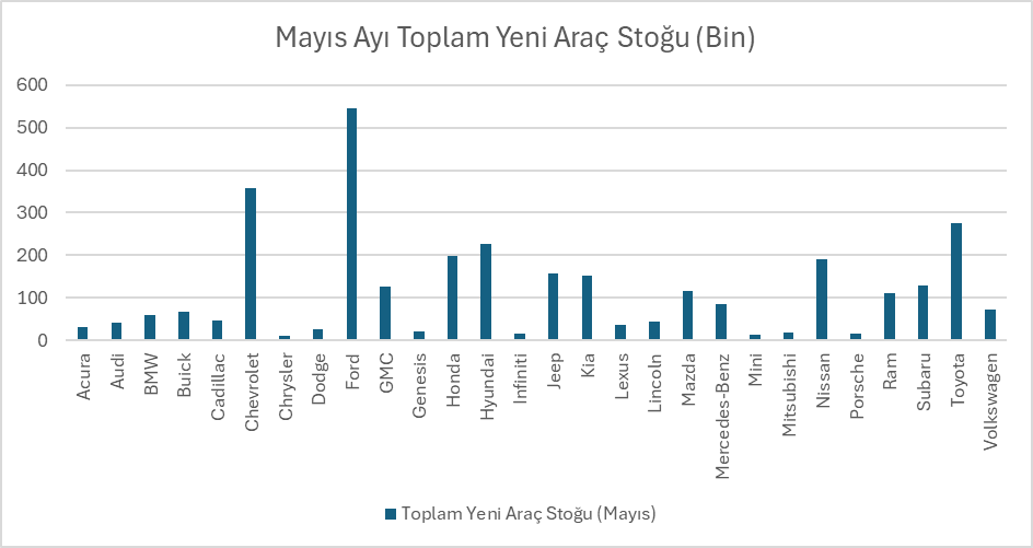 Mayıs ayı itibarıyla araç stoklarına bakıldığında, Ford markası 545.222 adetle en yüksek stok seviyesine sahip olup, onu Chevrolet ve Toyota gibi büyük markalar takip etmektedir. Hyundai, Honda ve Nissan da yüksek stoklarıyla dikkat çekmektedir. Lüks segmentte BMW, Mercedes-Benz ve Audi gibi markalar orta seviyede stok bulundururken, Genesis, Infiniti ve Porsche gibi markaların stokları nispeten daha sınırlıdır. Bu stok dağılımı, pazardaki talep çeşitliliğini ve markaların farklı segmentlerdeki konumlarını yansıtmaktadır; özellikle Ford ve Chevrolet’in geniş stokları, bu markaların pazardaki güçlü varlıklarını ve yüksek satış potansiyelini göstermektedir.