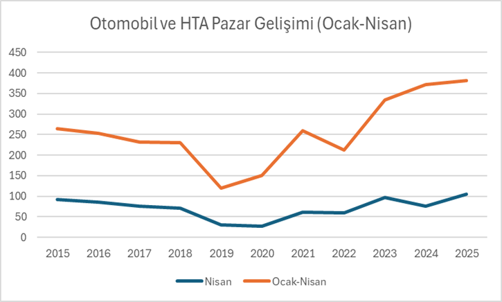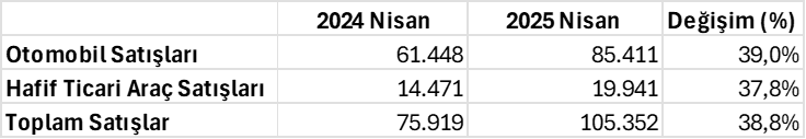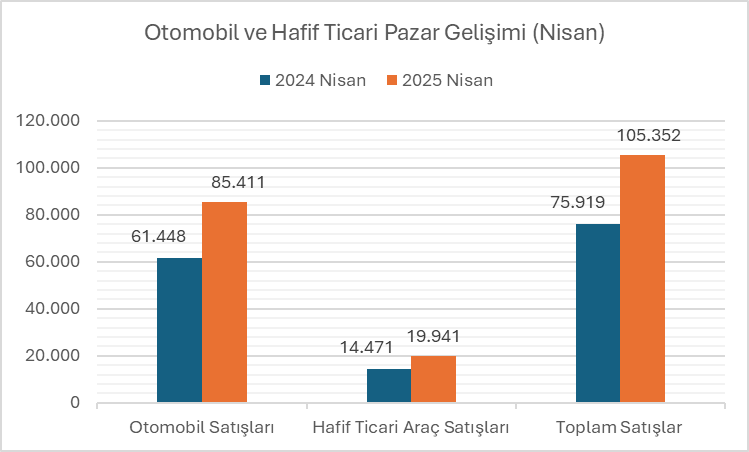 • Otomobil ve hafif ticari araç pazarı 2025 nisan ayında geçen yılın aynı ayına göre yüzde 38,8 oranında artarak 105.352 adet oldu.