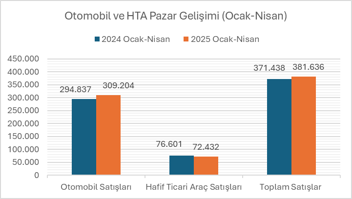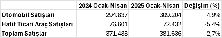 Otomotiv Distribütörleri ve Mobilite Derneği (ODMD) tarafından açıklanan verilere göre, 2025 yılı ocak-nisan döneminde Türkiye'deki otomobil ve hafif ticari araç pazarı, bir önceki yılın aynı dönemine göre %2,7 oranında artarak 381.636 adet oldu. 2025 Ocak-Nisan ayında otomobil satışları, bir önceki yılın aynı dönemine göre %4,9 oranında artarak 309.204 adede artarken, hafif ticari araç pazarı ise %5,4 oranında azalarak 72.432 adet oldu.