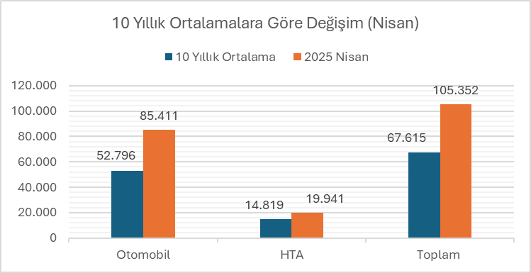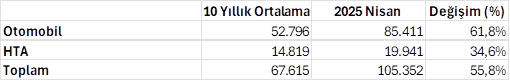 • Otomobil satışları, son 10 yıllık nisan ayı ortalama satışlarına göre yüzde 61,8 oranında arttı.