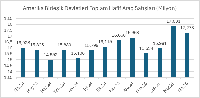 2025 Nisan ayında ABD’de hafif araç satışları, olası gümrük tarifeleri öncesinde tüketicilerin alımlarını öne çekmesiyle güçlü seyrini sürdürdü. Mevsimsellikten Arındırılmış Yıllık Satış Hızı (SAAR), Nisan ayında 17,27 milyon birim olarak gerçekleşti. Bu seviye, mart ayındaki son dört yılın zirvesi olan 17,83 milyon birimin altında kalsa da piyasa beklentisi olan 15.7 milyonun oldukça üzerinde kaldı. Geçtiğimiz iki ayda satışlar, ağırlıklı olarak tarife endişeleriyle hızlanan alımların etkisiyle yıllıklandırılmış ortalama 17,6 milyon birim seviyesinde gerçekleşti. Bu da tarifeler olmasaydı tahmin edilen 16,0 milyonluk satış hızının belirgin biçimde üzerinde.