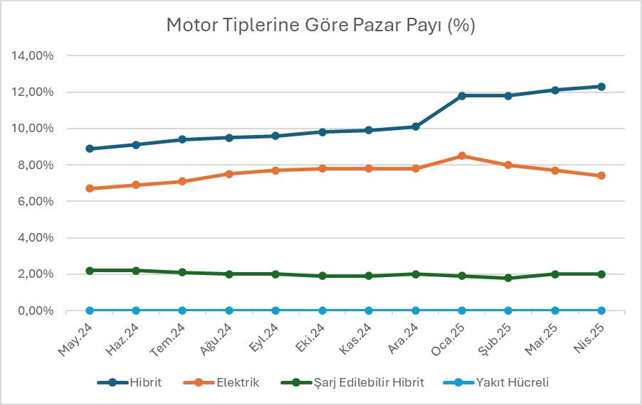 NADA tarafından paylaşılan verilere göre, hibrit araçların pazar payı sürekli artarak, Mayıs 2024'te %8,90'dan Nisan 2025'te %12,30'a yükseliyor, bu da hibrit araçların pazarın en büyük oyuncusu olmaya devam ettiğini gösteriyor. Elektrikli araçların pazar payı ise daha yavaş bir artış gösteriyor, Mayıs 2024'te %6,70 iken Nisan 2025'te %7,40'a çıkıyor. Şarj edilebilir hibrit araçlar ise sınırlı bir pazar payına sahip olup, düşüş eğiliminde (Mayıs 2024'te %2,20 iken Nisan 2025'te %2,00). Yakıt hücreli araçlar ise sıfır pazar payıyla, bu dönemde neredeyse hiç tercih edilmemiş görünüyor. Genel olarak hibrit araçlar liderliğini sürdürürken, elektrikli araçlar nispeten daha yavaş bir şekilde büyüyor.