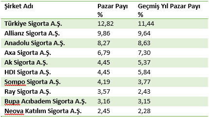 TSB sigorta sektörü verilerine göre; şirket sıralamasında Türkiye Sigorta A.Ş yüzde 12,82’lik Pazar payı ile sektörü domine etmeye devam ediyor. Sıralamada Allianz Sigorta A.Ş yüzde 9,86 ile ikinci sırada yer alırken, Anadolu Sigorta Şirketi yüzde 8,27 ile üçüncü sırada yerini aldı.