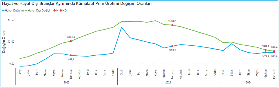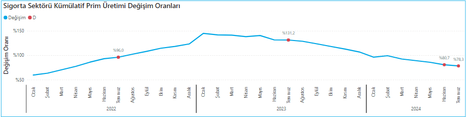 TSB sigorta sektörü verilerine göre; sektör 2024 yılının ilk 7 ayında önceki yılın aynı dönemine göre prim üretiminde yüzde 78,3 oranında artış göstererek 442.545 Milyon TL hacme ulaştı. Bu oran 2023 yılının ilk 7 ayında 2022 yılının aynı dönemine göre yüzde 131,20 oranında artış ile 248.205 Milyon TL olarak gerçekleşmişti.