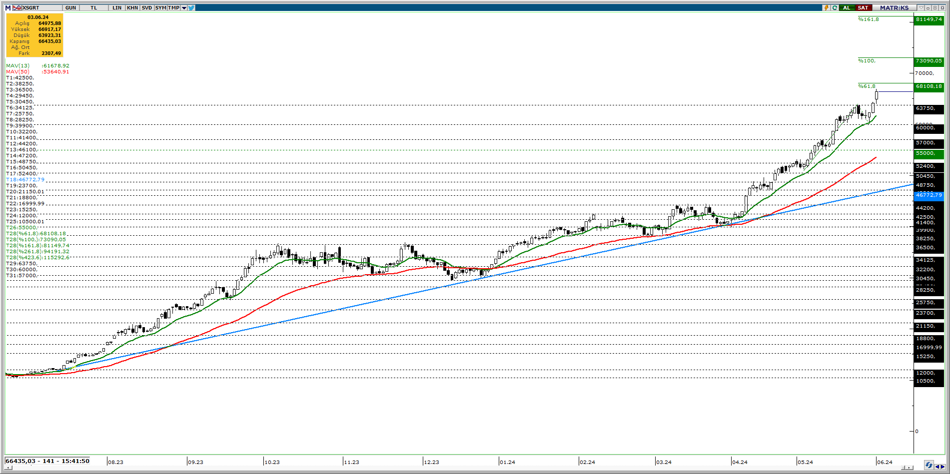 2023 Temmuz ayından beri istikrarlı yükseliş ivmesinde olan Sigorta endeksi, son birkaç gündür baskı gördüğü 63750 seviyesi de aşarak, referans göstergeler olarak takip ettiğimiz 13 ve 50 günlük üssel hareketli ortalamalar üstünde pozitif ivmelenmeye devam ediyor. Endekste mevcut durumda yükselişin devam etmesi durumuda Fibonacci Expansion 68100, 73090, ve 81150 seviyelerine doğru yükseliş gerçekleşebilir. Aksi takdirde endekste olası geri çekilmelerin gerçekleşmesi durumunda ise 63750, 60000 ve 57000 seviyelerine doğru düşüş gözlenebilir.