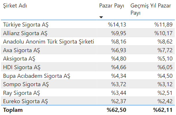 TSB sigorta sektörü verilerine göre; şirket sıralamasında Türkiye Sigorta A.Ş yüzde 14,13’lik Pazar payı ile sektörü domine etmeye devam ediyor. Sıralamada Allianz Sigorta A.Ş yüzde 9,95 ile ikinci sırada yer alırken, Anadolu Anonim Türk Sigorta Şirketi yüzde 8,16 ile üçüncü sırada yerini aldı.