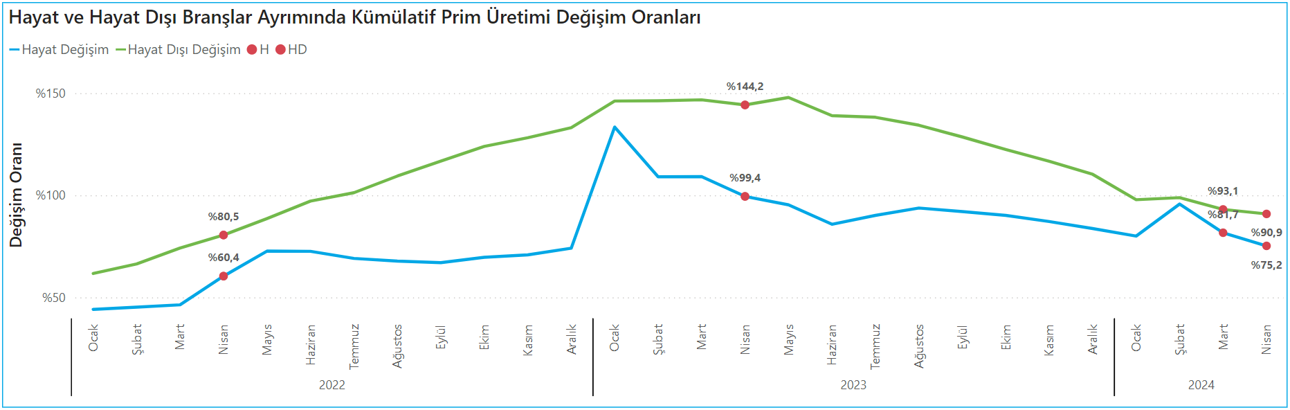 Toplam prim üretiminin 228 milyar TL’si hayat dışı sigortalardan, 31 milyar TL’si ise hayat sigortalarından gerçekleşti. Yılın dört aylık döneminde hayat dışı sigortalar  yüzde 90,9, hayat sigortaları ise yüzde 75,2 büyüdü.